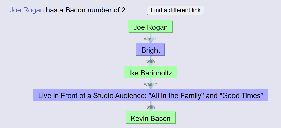 For me, I’m not an actor, but my chain to Kevin is just three people long. A long time ago, I got to meet and chat with Joe Rogan when he came to a local comedy club in Austin. According to “The Oracle of Bacon”, Joe is only twice removed from Kevin: